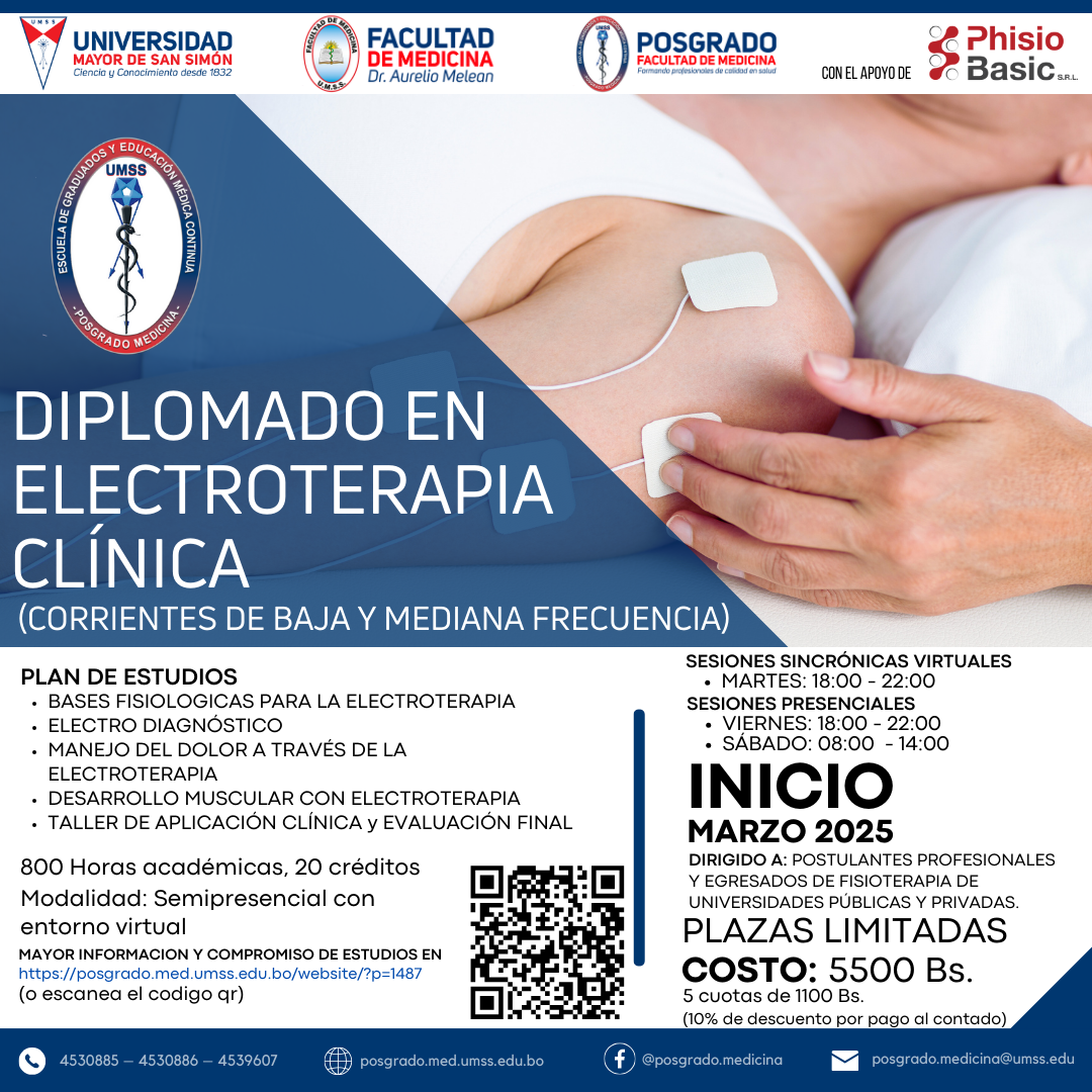 - Pagar la Matrícula en caja de Posgrado Medicina UMSS Av. Aniceto Arce N.º 0371 Facultad de Medicina UMSS o via QR con las credenciales enviadas por correo electrónico.